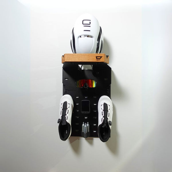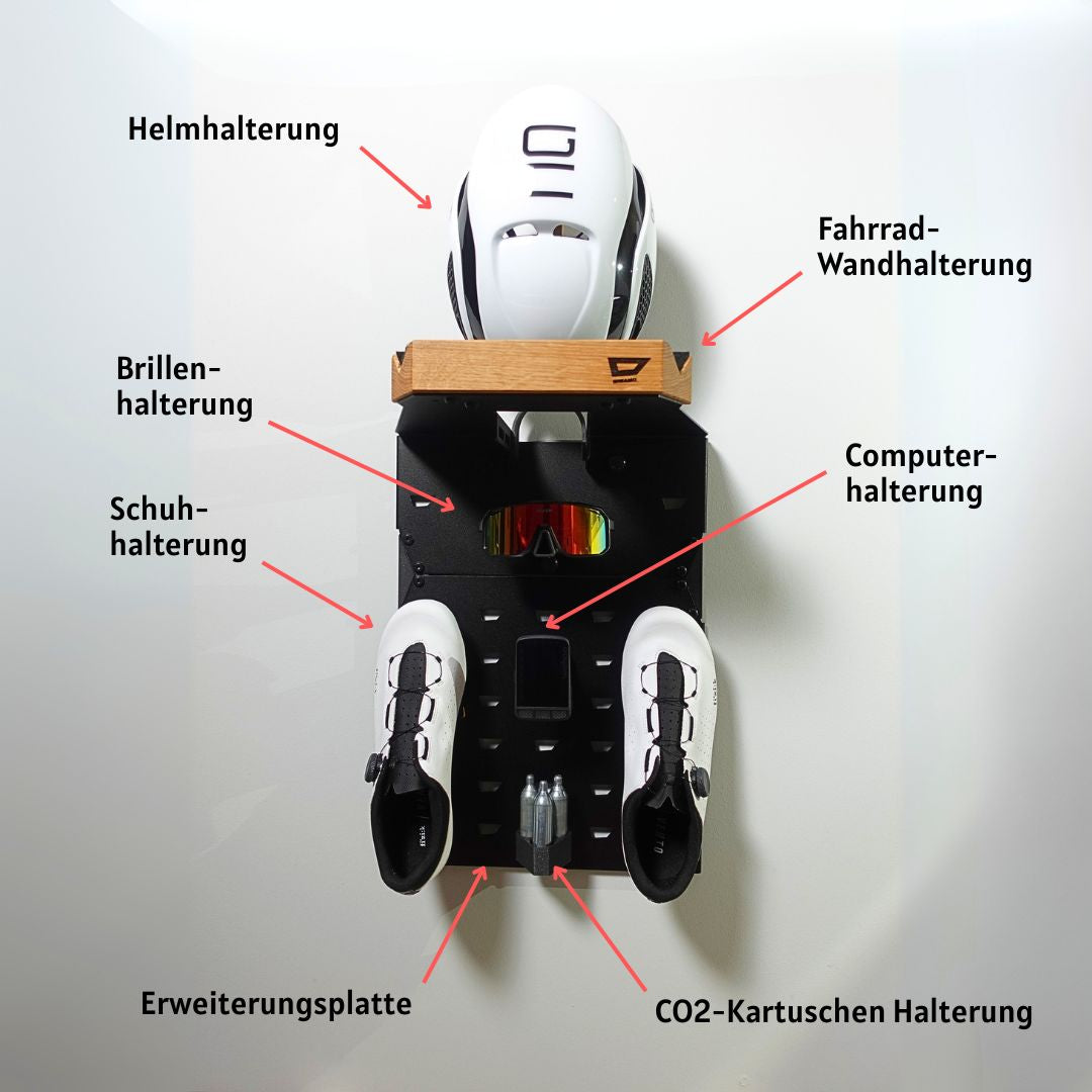 Das absolute Maximum: Erweiterungsplatte, Halterungen für Helm, Schuhe, Brille, Computer und sogar CO₂-Kartuschen/Reifenheber.
